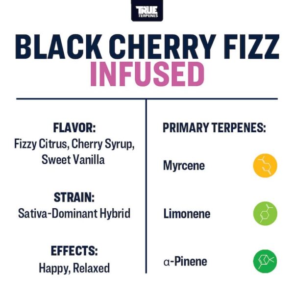 Classic black cherry soda, hints of vanilla, and the refreshing finish of a fizzy fountain drink hit the spot in this nostalgic, flavor-forward tribute to the Black Dahlia x Ace of Spades cross. Lemon-lime notes effervesce off the top of tasty, sweet vanilla and black cherry, coated with a soft powdered sugar tartness that makes Black Cherry Fizz terpene strain an uncanny recreation of a sweet sip of cherry cola.