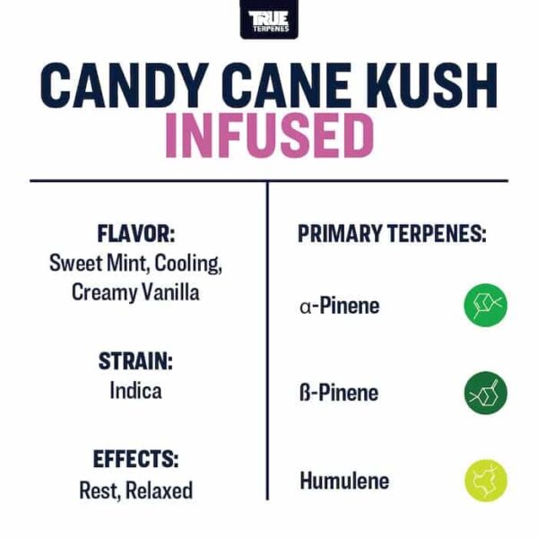 Candy Cane Kush terpene strain is a delightfully light and sweet sleigh ride straight to winter wonderland. Dash through the snow without leaving your couch with this cooling combination of sweet mint and creamy vanilla inspired by the cross between the AK-47, Mango, and White Widow.