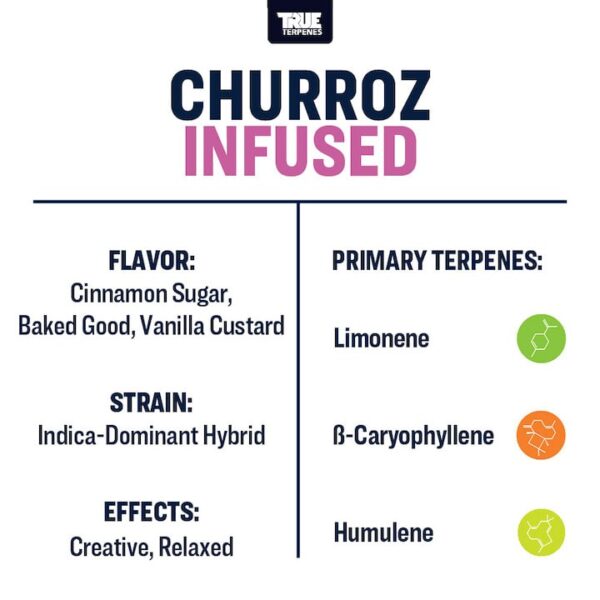 The sweet, bready flavor of cinnamon sugar-coated churros dipped in warm vanilla cream dominates our flavor-infused take on the trending dessert strain, a cross of Face Off OG, SFV OG, and OG Kush. Caramelized vanilla infuses the light, fluffy pastry base, while a sweet cinnamon sugar crust gives a warm and spicy, slightly earthy finish to Churroz terpene strain.