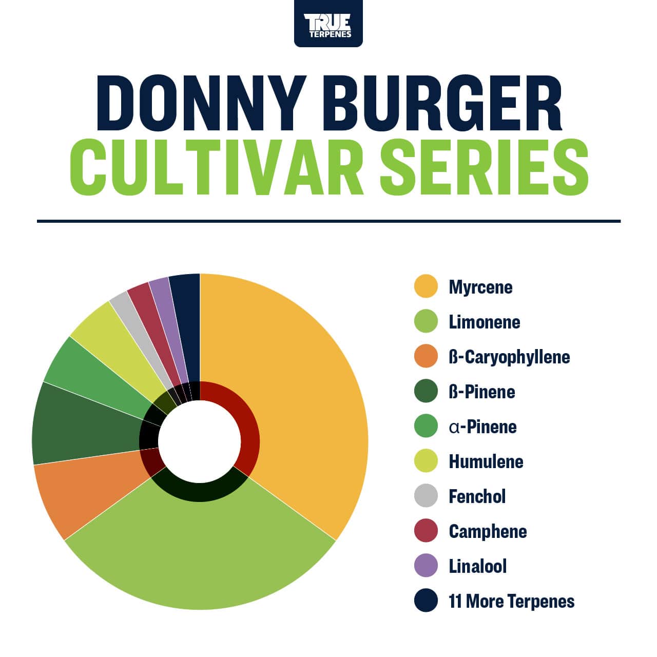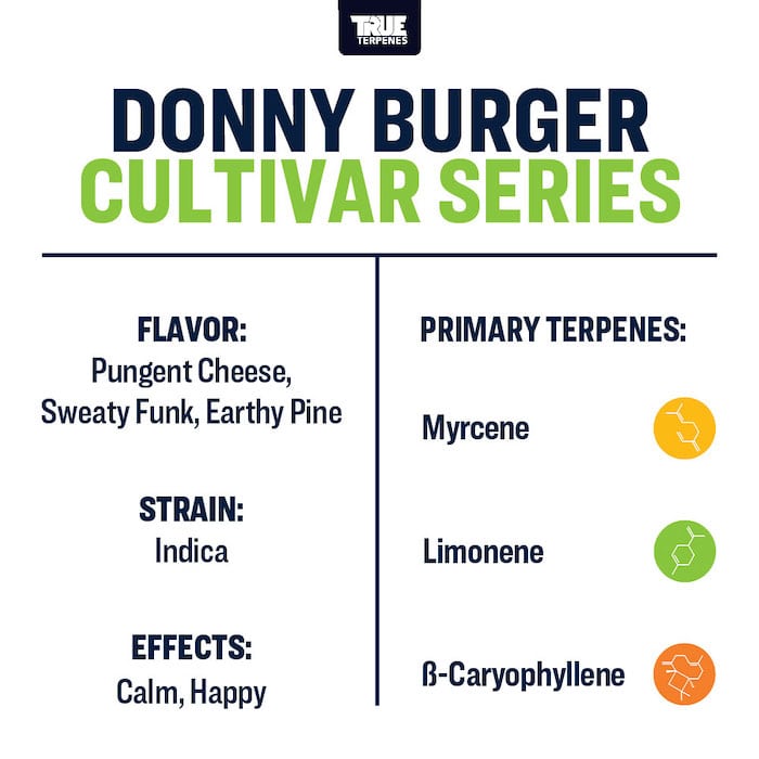 Donny Burger terpene strain is an unforgettably dank delicacy rimmed with a savory funk. A stanky, ammonia-laced Brie cheese funk oozes across the top of the hit, melting onto the greasy dish of a medium garlic burger plated on a glistening puddle of sweet diesel. Thick, dry pine brings in a savory but fresh earthiness to cleanse the palate of this complex and beefy cross between GMO and Han-Solo Burger.