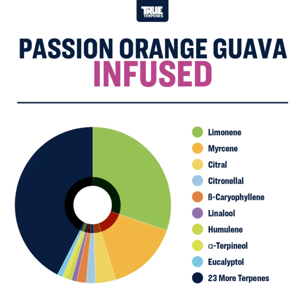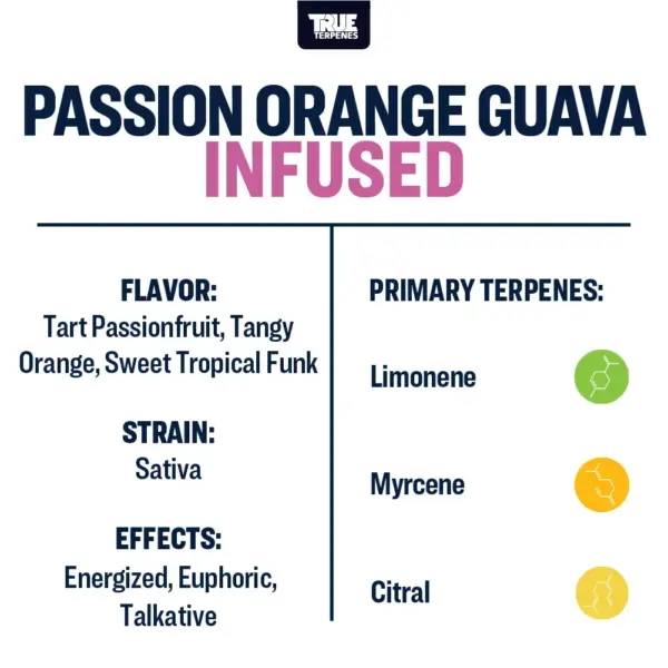 Bright bursts of sweet zesty orange and tart pops of passionfruit blend with ripe guava to bring just the right amount of fruity funk to Passion Orange Guava terpene strain. This vibrant cross of Tangie x Guava Dog puts a refreshing spin on a tropical flavor profile. No wonder the sweet nectar of P.O.G. has become the ultimate way to chase a tropical escape. Bold, layered, and just the right mix of tangy-sweet, Passion Orange Guava will keep you coming back for more.