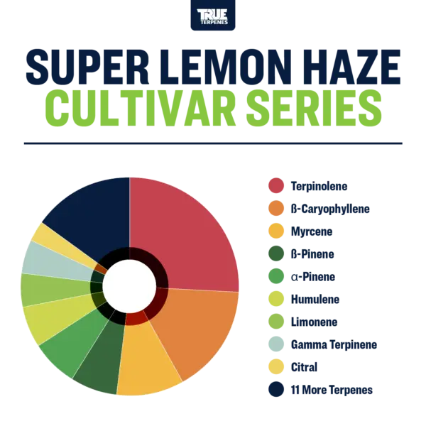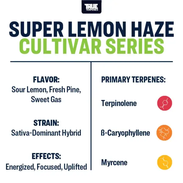 We’ve terp-hunted the loudest citrus strains at their peak. This is it. Tart and sweet as a lemon sucker with a splash of fresh lime, all layered over a backbone of Terpinolene haze. Add a sprinkling of pine needles on top and you’ve got Super Lemon Haze terpene strain. This iconic citrus profile is more in demand than ever, thanks to its award-winning Lemon Skunk x Super Silver Haze lineage, distinct flavor and aroma, and reputation as the ultimate uplifter.